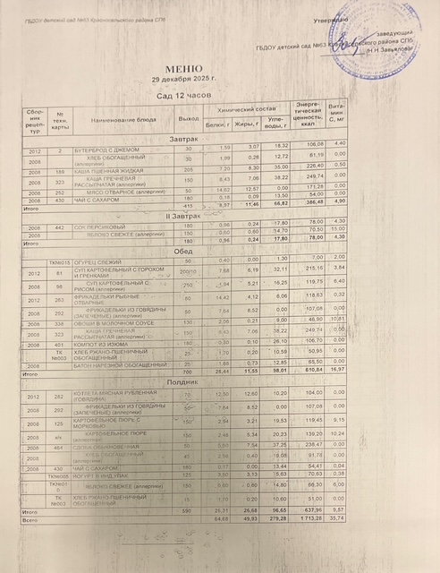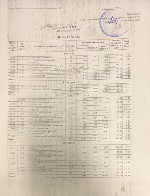 Ежедневное меню: 29.12.2025 сад, ясли